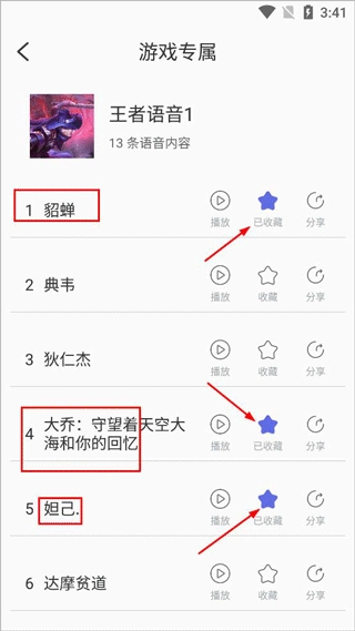 打开后,你可以试听各个角色的语音包,挑选喜欢的进行收藏。