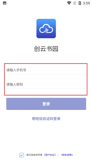 进入【创云书院】的登录页面,选择账号密码登录方式,依次填写【请输入手机号】和【请输入密码】对应的内容,然后点击【登录】按钮。