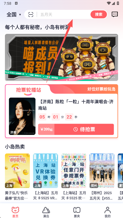 1、打开纷玩岛App后,在首页找到抢票专区,或者通过顶部的搜索框输入想要抢票的演唱会名称。