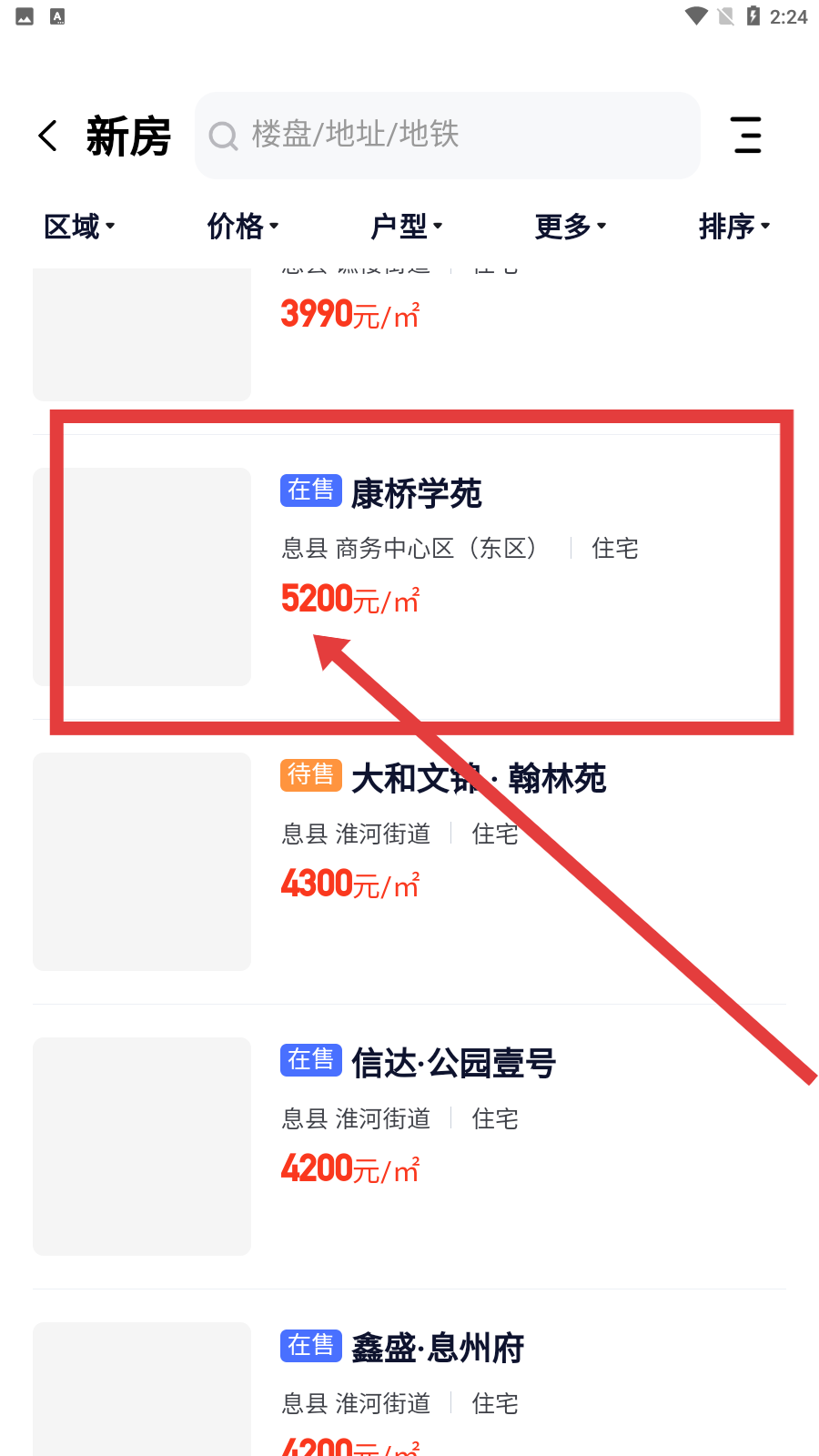 3、在新房列表中,点击目标楼盘(例如“康桥学苑”)对应的卡片,即可进入该楼盘的详情页面。