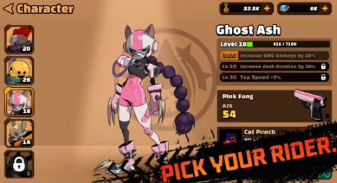 3、主动收集各类角色,用心升级摩托,全面强化速度、武器与个性,决心成为万众瞩目的最强猎人。