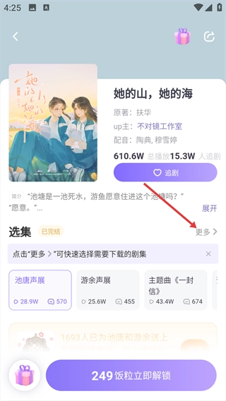 2、进入详情页后,点击【更多】按钮,即可展开完整的选集列表。