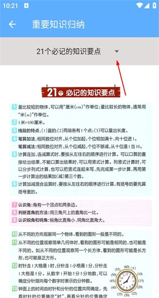 2、进入知识手册页面后,找到重要知识归纳板块,查看其中的21个必记知识要点,从中了解长度单位等相关内容。
