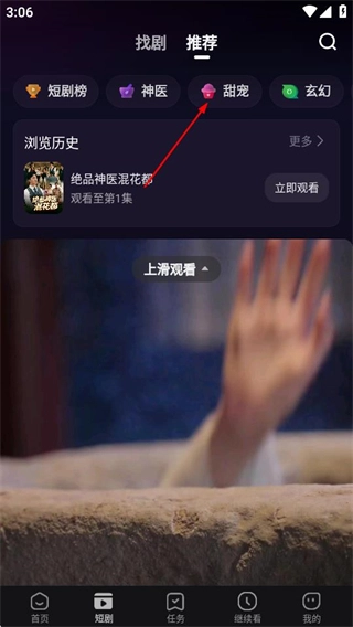 在短剧页面,点击甜宠标签,即可切换到甜宠类短剧的列表页面。