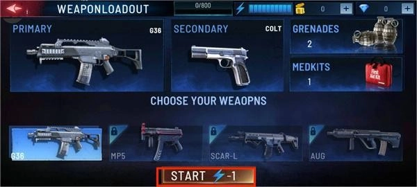 5、选好枪支后,点击START并消耗一点蓝即可进入游戏;