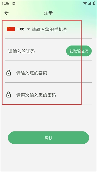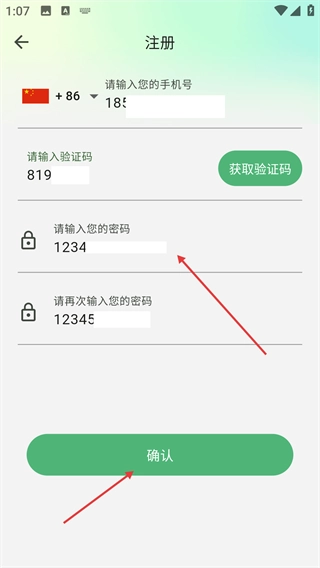 2、进入【注册】页面,依次填写【手机号】、点击【获取验证码】,接着设置并确认密码,操作完成后点击【确认】按钮。