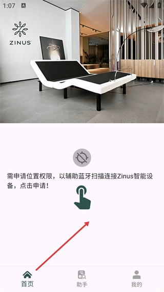 4、进入【首页】后,系统会请求位置权限来帮助蓝牙连接【ZINUS】智能设备,点击允许该权限申请就能完成配置。