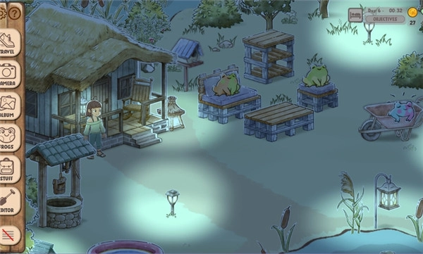 3、部分家具会触发青蛙的特殊动作,比如跳上木椅打盹、蹲在石桌上发呆,这些充满趣味的小细节让避难所显得更有生机与活力。