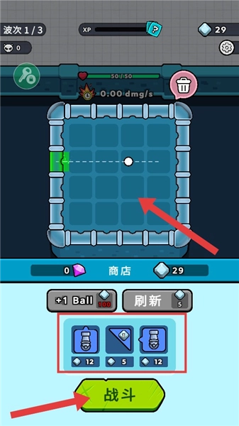 1、在开战前的布局界面,可消耗钻石购买炮台、弹射角度等道具,待防御布置妥当后,点击战斗按钮即可启动波次攻击。