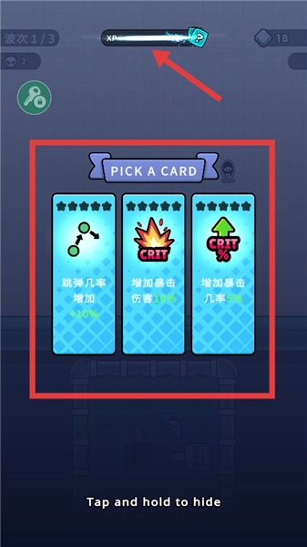 3、击败敌人后可获得经验值,升级时能从跳弹几率、暴击伤害、暴击几率等增益卡牌中进行选择,以此来增强弹球的战斗能力。