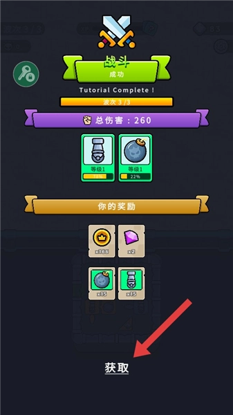 4、顺利闯过所有波次后,点击领取按钮即可获得金币、道具等奖励,这些奖励可用于后续关卡的炮台升级以及道具购买。