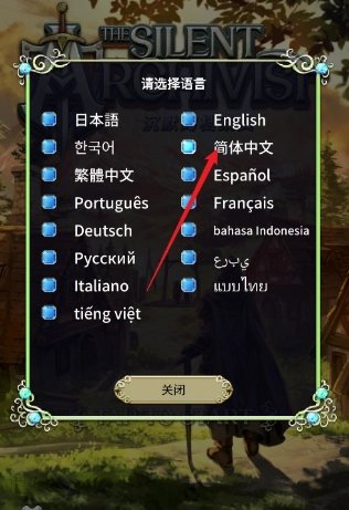 2、在这里能够选择语言,我们选的就是【中文简体】,接着点击【关闭】按钮,回到游戏的初始页面后,点击【TAP TO START】,就能开始进入游戏了