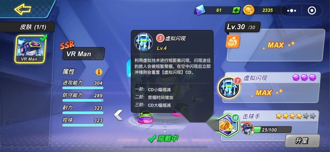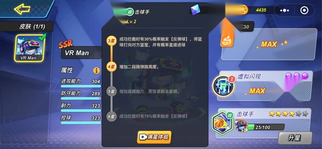 VR Man建议先培养到四星再派上场作战,前期可以先用其他角色去获取资源来提升他。要是没到四星就用的话,他的反弹球技能效果会比较差,主要是因为跳跃高度不足,很难击中对手投过来的球。