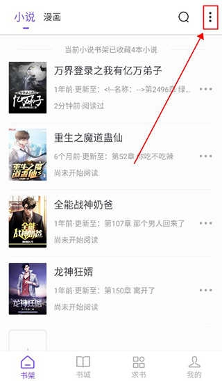 1、在书架页面,点击右上角的更多选项图标(三个点样式)。
