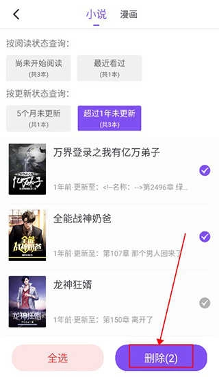 3、使用顶部的筛选功能,找出想要删除的小说或漫画条目。