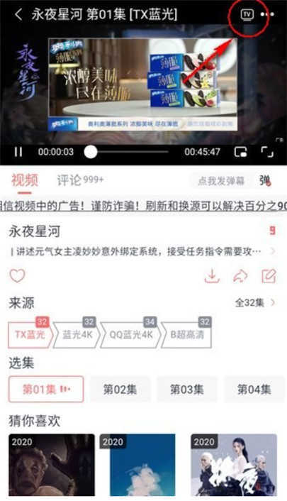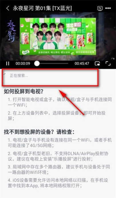 3、找到播放页面的右上角,点击那里的【TV】图标,系统会自动搜索附近可用的设备,您只需稍等一会儿,等电视设备出现在搜索结果中即可。