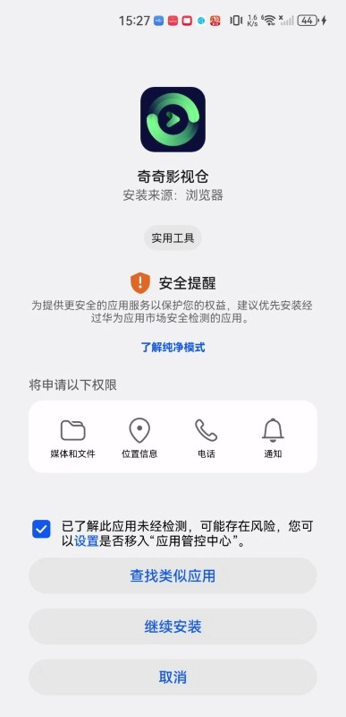 3、第三步,点击勾选“已了解此应用未经检测……”这一选项,接着点击“继续安装”按钮。(过程中若出现安全提醒,无需惊慌)
