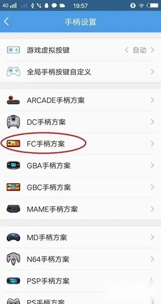 8、根据自己游玩的游戏类型,每次进入游戏前先进入手柄设置界面,找到对应游戏类型的选项,完成键位配置后返回,再进入游戏。本教程将以“FC手柄方案”为例进行设置演示。