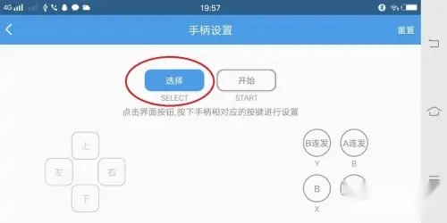 9、进入FC手柄设置界面,用手指点击“选择”按钮,接着操作手柄上的按键,将手柄按键与游戏按键进行对应设置。此时若看到手柄设置界面中的按键呈现蓝色填充状态,即表示该按键设置成功。按照同样的方法将其他按键一一对应设置完毕后,点击左上角的返回按钮,系统会自动保存所有设置。