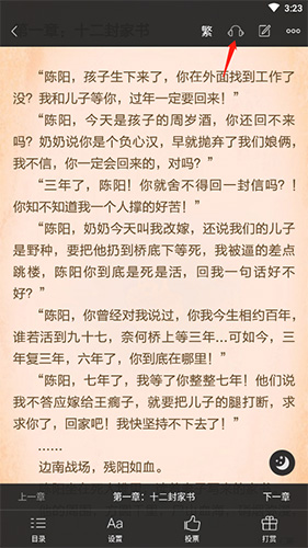 4、开启听书功能的操作步骤:在阅读界面点击屏幕中间位置,调出工具栏后,点击工具栏右上角的“听书”图标即可。
