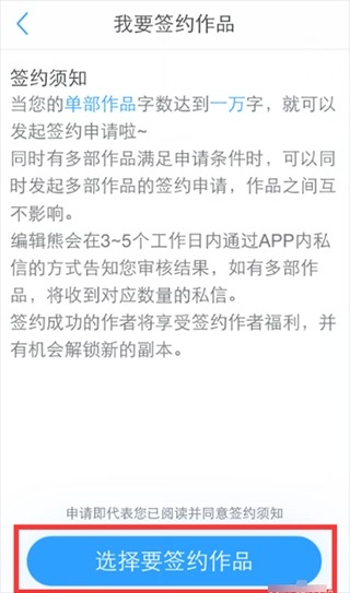 7、认真阅读《签约须知》后,点击下方的“选择要签约作品”