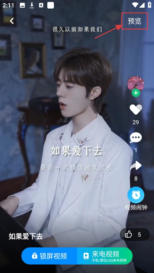 2、在视频播放页面,点击【预览】按钮,就能提前查看将该视频设为来电视频的效果,非常方便。