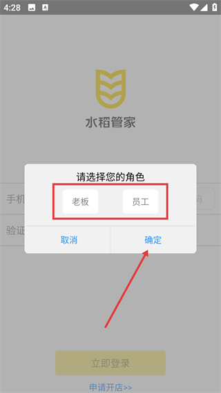 2、在【请选择您的角色】弹窗里,选好【老板】或【员工】的身份,再点击【确定】按钮,就能完成角色的选定操作。