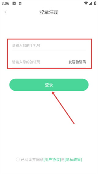 2、进入【登录注册】页面后,先在输入框中填写【请输入您的手机号】对应的内容,接着获取并填写验证码,完成这些操作后点击【登录】按钮。