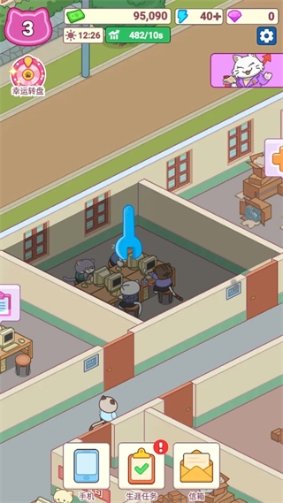 2. 深度策略玩法:整合资源调配、员工组合、危机处理等多样策略元素。玩家要根据产能、金币等数据灵活调整运营方案,比如科学部署不同技能的猫猫员工,协调设备更新与员工福利,既保留休闲特质又具备策略深度。