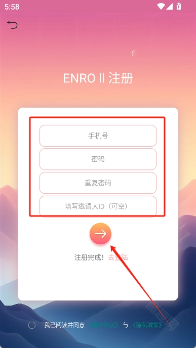 4、填写手机号码,设置密码,完成这些信息的填写后点击“注册”按钮,即可完成注册流程。