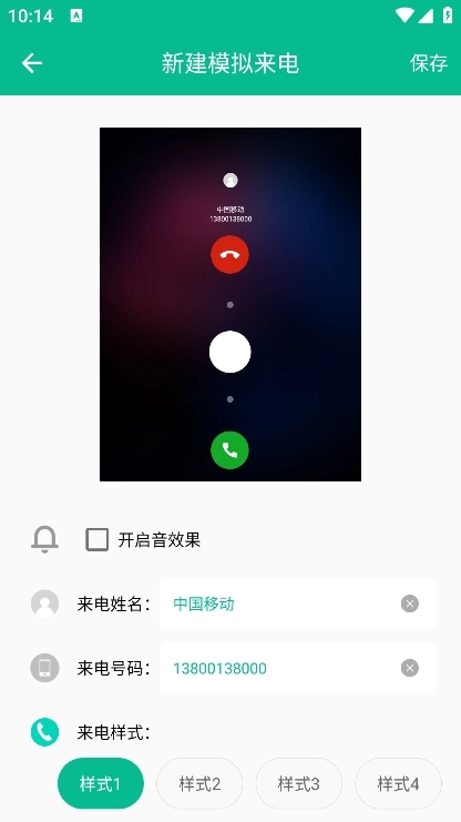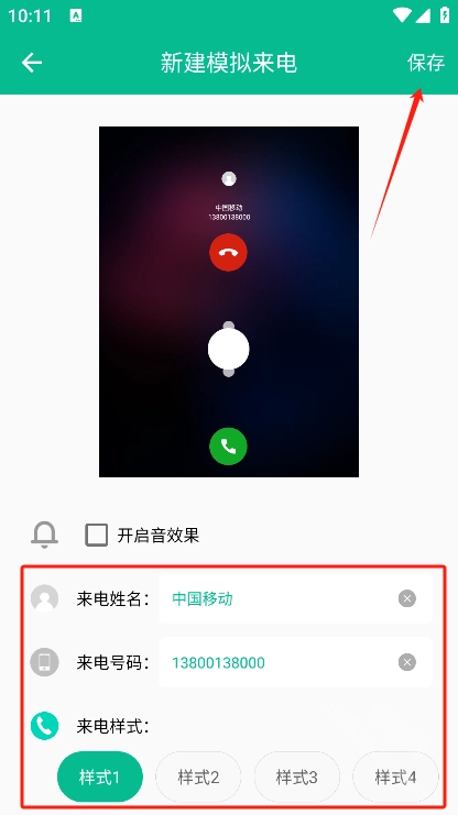 3、进入设置界面后,先对来电号码、姓名和来电样式进行设置,完成后点击右上角的“保存”按钮。