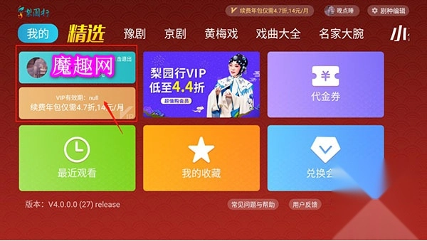 1、首先在魔趣网安装本站提供的梨园行戏曲TV应用,然后打开该软件进入。