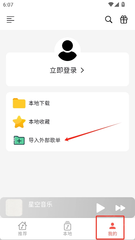 7、在“我的”页面里找到“导入外部歌单”功能,就能把其他音乐平台的歌单导入到当前平台中了。