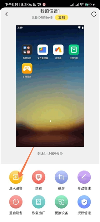 进入云手机界面后,可对其执行多种操作。若想进入该手机,点击“进入设备”即可。