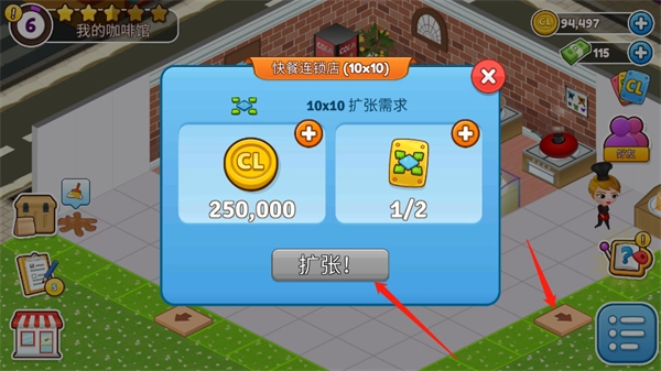 4、要是你感觉自己的餐厅空间不够用,可以点击箭头进行扩建,但前提是要满足扩建所需的条件。