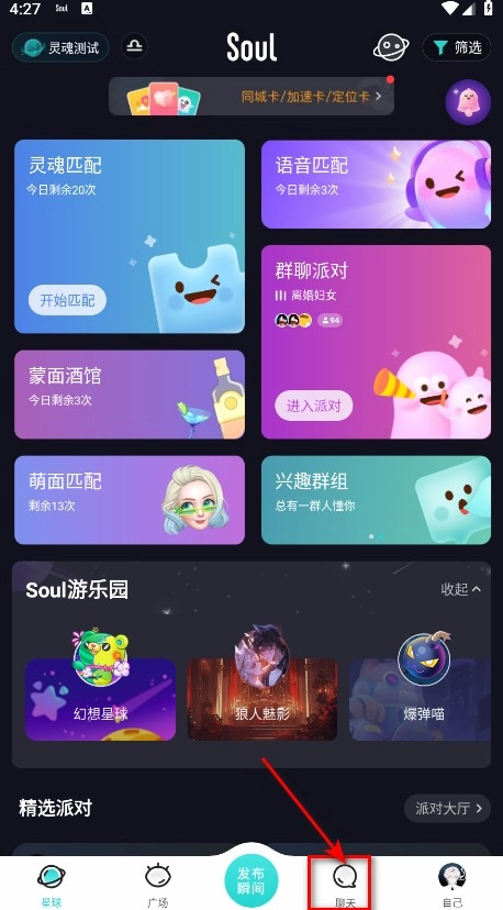 2、星球页面,可查看当前在线人数,以及soul狼人、恋爱铃等玩法功能。