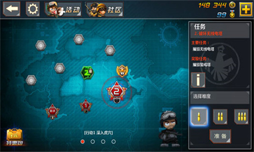 进入角色选择界面后,能看到多个功能图标。左上方有返回键和设置选项,点击返回键可回到主菜单,设置选项用于调整音效和画质。右上方显示当前拥有的命令点数和勋章数量,这两项资源可用于升级装备、解锁新角色等,可通过游戏内收集或商城购买获取。中间区域是武器、装备和角色管理入口,可在此进行武器升级、装备更换以及添加新兵种。右下角是开始战斗按钮。