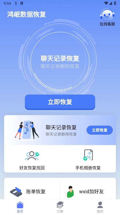 进入首页后,能看到多个数据恢复板块,涵盖了相册恢复、好友恢复以及账单恢复等功能。