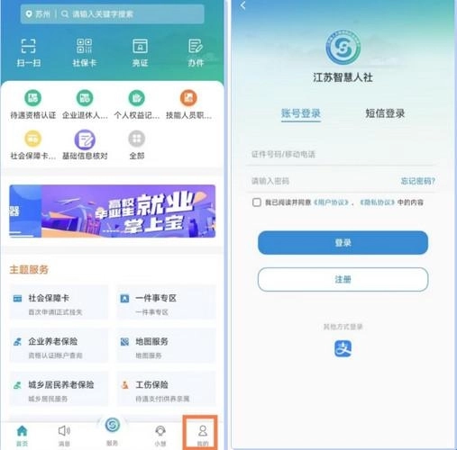 1、打开“江苏智慧人社”手机APP或小程序,点击“我的”页面,完成注册登录操作。