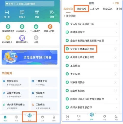 2、点击页面中间的“服务”板块,从中选择“社会保险”选项,再点击“企业职工基本养老保险”这一项。