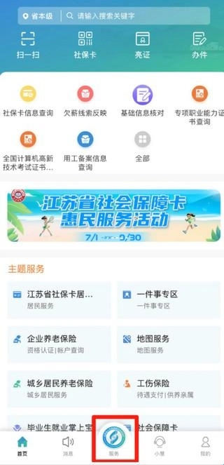 1、打开“江苏智慧人社”应用,登录账号后,点击首页底部的“服务”选项。