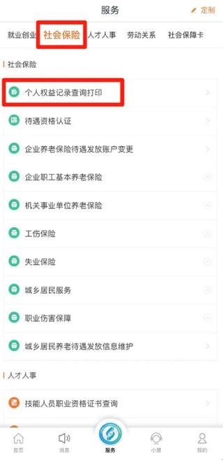 2、在顶部菜单栏找到“社会保险”选项并点击,接着选择“个人权益记录查询打印”功能。