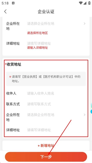 3、在收货地址区域,依次填写收件人、联系方式、企业所在地及详细地址,点击“下一步”按钮,即可完成认证流程。