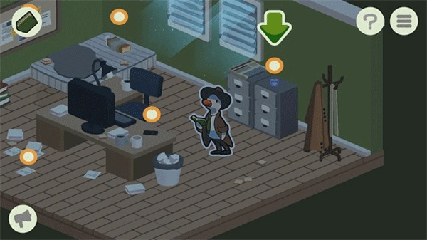 点击屏幕就能操控鸭子侦探移动,要是场景里出现黄色圆圈,点击这些圆圈就能查找关键线索。