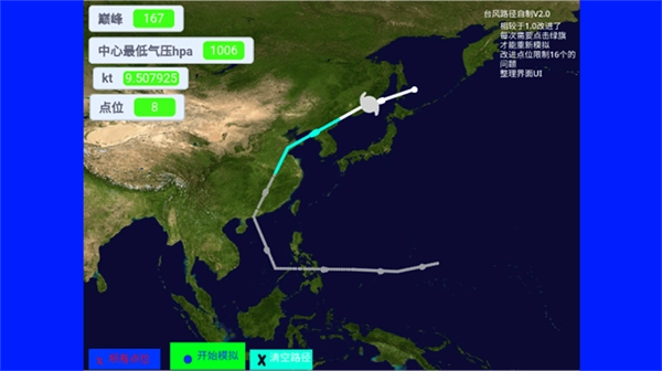 3、完成点位设置后,点击“开始模拟”按钮,即可对台风的移动路线及相关情况进行模拟。