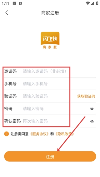 1、在登录界面点击【注册】选项,即可进入商家注册的信息填写页面。
