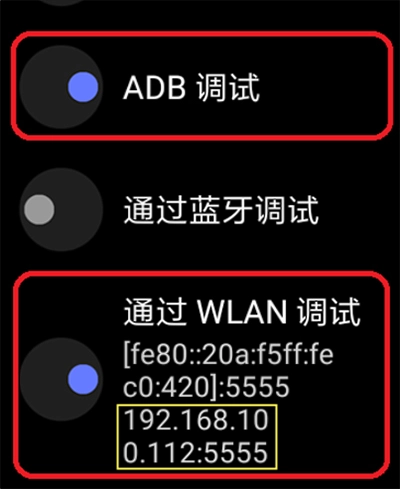 3、开启ADB调试和WLAN调试,记录IP地址。