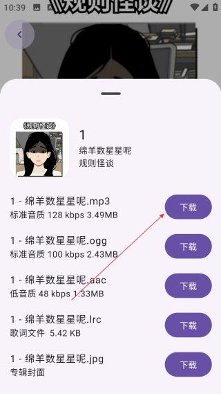 3、进入音频详情页后,点击【按钮】,会弹出该音频对应的格式选择菜单。