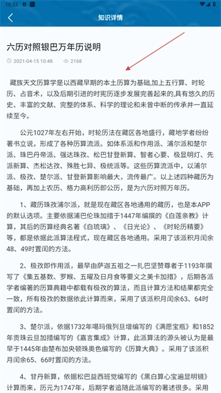 4、在知识页里挑选相应条目,进入知识详情页面后,就能查看藏历的历史演变、主要流派等详尽的天文历算知识内容。