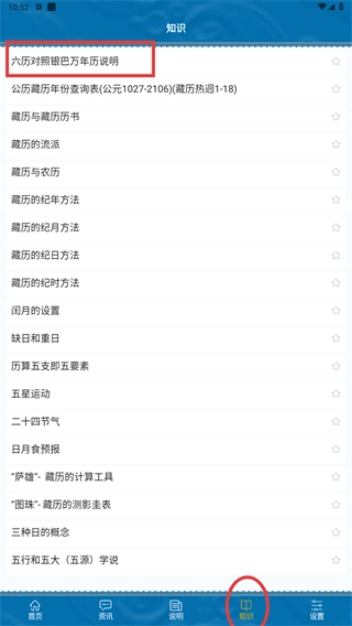 3、点击底部的【知识】按钮进入知识页面,即可查看“六历对照银巴万年历说明”等与藏历相关的知识条目列表。